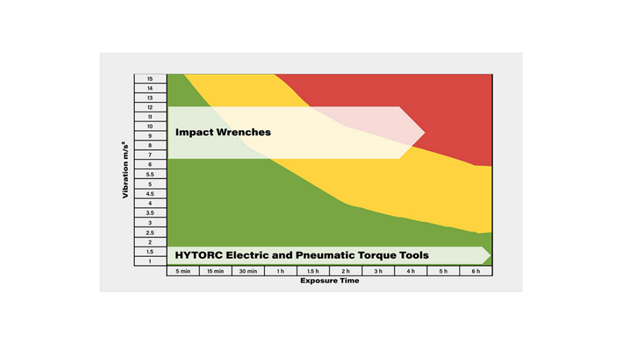 Vid planering av repetitiva skruvjobb som sträcker sig över tid rekommenderas lågvibrerande momentverktyg som HYTORC Lithium Guns och pneumatiska jGun för att minimera risker. Alla dessa verktyg har vibrationsexponering som är tio gånger lägre än slående mutterdragare. Som visas i diagrammet nedan har HYTORC:s elektriska och pneumatiska momentverktyg uppmätta vibrationsvärden mindre än 1,5 m/s2. Dessa verktyg kan användas av en operatör för skruvjobb under en hel dag och ändå förbli i kategorin ”låg risk” utan oro eller risk för bestående skador.